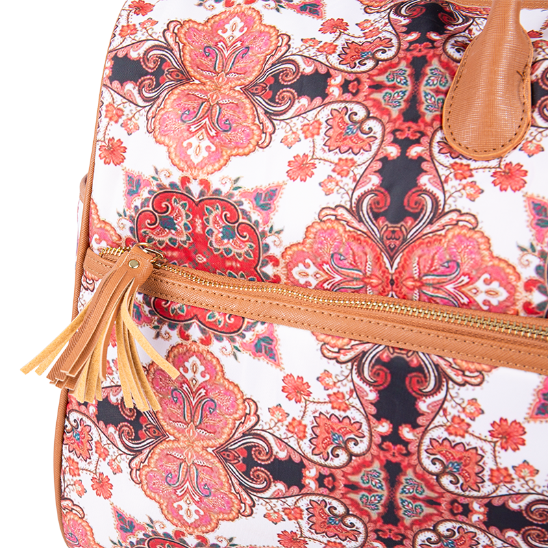Эта сумка оснащена сложными принтами, которые смешивают винтажные тропические узоры с культовыми элементами Юго -Восточной Азии, такими как цветы монограммы. Натуральные коровьи складыши добавляют ретро -прикосновение к стилю.